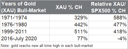 The new All Time High (ATH) in the price of gold confirms that we’ve entered the 4th gold bull-markets since the 1971 Nixon Shock when US President Nixon decoupled the USD from gold (prices reach a new record high during each cycle). Gold has rallied 75% from late 2015 to July 2020 which is tiny in comparison to those three bull-markets (monthly data). In the 1971-1974 bull market gold rallied 330%, in the 1976-1980 bull-market gold rallied 440% and in the 1999-2011 bull-market gold rallied 511%. Gold would have to rally another 240% to match the previous cycles, which suggests we’re very early in the 4th post-1970 bull market.