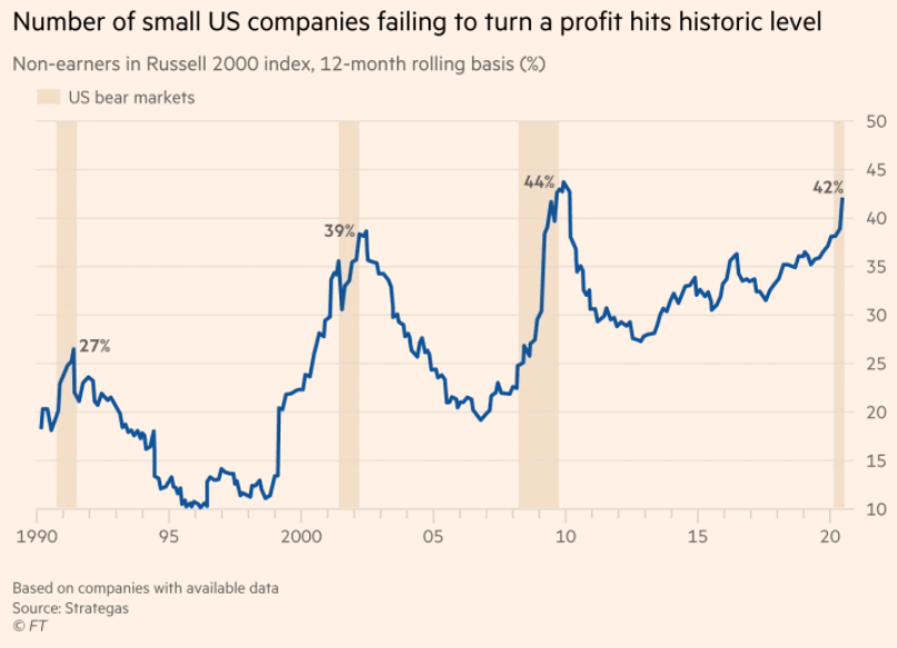 It’s clear that society has made bad investment decisions because the investments aren’t providing the returns to pay down debt. Another simple way to view the number of bad investment decisions is the number of companies that are failing to return profits. Non-profitable companies are bad business decisions. These companies should be liquidated, but they aren’t, and the capital should be reallocated elsewhere, but it is not. The jargon we use to refer to these companies is zombie companies, because they’re walking dead! The number of US small cap zombies rises to a new record high during each recession.