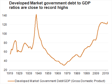The ratio of advanced economy government debt to Gross Domestic Product (GDP) is above 120%, at its highest levels since WW2. There’s more government debt than the size of these economies.