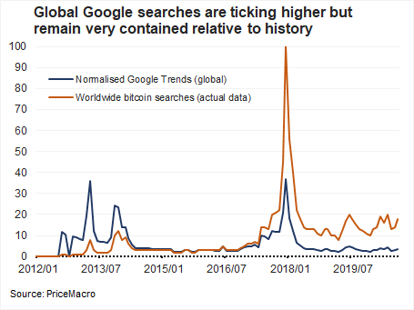 Gold is catching headlines because it’s at a new all-time high, but bitcoin has gained relative to gold since the start of the year. Technically, bitcoin also appears to be breaking out of a downward trend vs. gold that has held since 2017, suggesting the potential for additional bitcoin outperformance vs gold. Relative outperformance of bitcoin vs. gold in the order of 100% would take these assets back to the levels seen in December 2017. It is an outcome that I’d assign a greater than 50% probability of occurring over the next 2 years. As a reminder, I’m also bullish gold over this time horizon. Bitcoin’s scarcity and tiny market capitalisation relative to gold, combined with its digital decentralised nature, make it a much more exciting return prospect than gold. The bitcoin price has reflected some of this optimism, but it has yet to truly enter speculative frenzy. This is good news – the later the speculative phase emerges, the more time there is for accumulation.