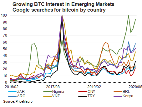While global BTC interest is still pretty contained, interest in Emerging Markets is rising. All global citizens have potential use-cases for bitcoin, but these are more acute in emerging markets where currency devaluation and negative regulatory changes are higher probability events.