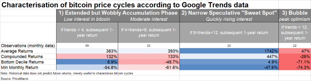 - The 2nd phase is the narrow speculative sweet-spot when interest is higher than the accumulation phase but lower than the bubble. This phase has 12 monthly observations since 2012, only 15% of total observations. It is characterised by incredibly strong returns as the market kicks into hype and heads towards a bubble. Returns are stronger than the accumulation phase and historically the bottom decile of returns are also positive. The market tends to rally aggressively and during bear markets, when the price is falling, interest very rarely stabilises in this range. This is the sweat-spot for speculative activity but it also generates emotive reactions as holders experience substantial increases in wealth and non-holders experience FOMO. The challenge for investors is two-fold. First, one doesn’t want to miss-out on this period because the returns are sizeable. Second, one needs to considering selling near the end cycle to avoid the bubble.