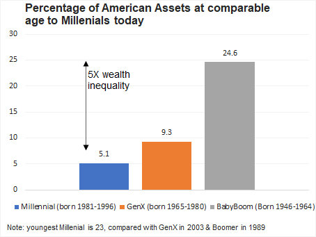 Pew Research Center reports that share the of aggregate income held by upper income US households rose from 29% in 1970 to 48% in 2018. By contrast, middle income households’ share of aggregate income fell from 62% in 1970 to 43%. Generational wealth inequality is even starker than income. Millennials (born between 1981 & 1996) are the first American generation poorer than their parents. Millennials hold 5.1% of total US assets compared to Baby Boomers (born between 1946-1964) who held 25% of total assets at a similar age.