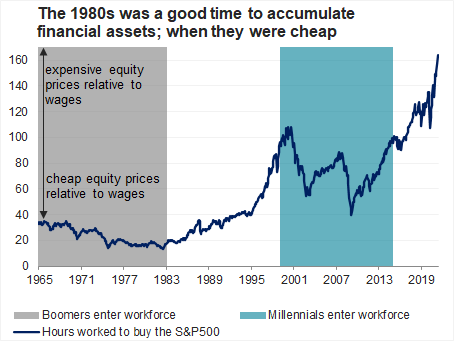 Returning to our generational lens, US interest rates peaked and government debt troughed when Baby Boomers entered the workforce in the 1960s and 1970s (graph above). Boomers were able to use low interest rates and debt to purchase financial assets at cheap prices. For example, it took the average US non-supervisory worker 25 hours of work to buy the S&P500 in the 1980s (graph below). The hourly cost of the S&P500 remained below 45 into the 1990s giving Boomers plenty of time to accumulate wealth at cheap prices. In contrast to Boomers, Millennials are attempting to buy financial assets when global debt levels are heading to record highs and interest rates are near record lows.