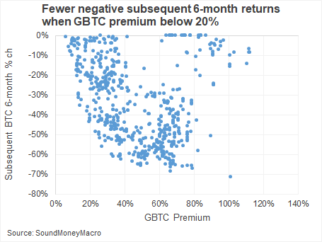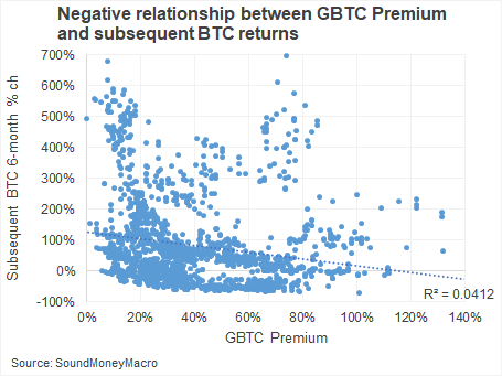 Here’s a visual representation of the premium vs. subsequent 6-month BTC-USD returns. Not a perfect relationship but the negative correlation is noticeable.