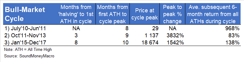 Subsequent 6-month returns have been very strong. In the 2010/2011 cycle, the average 6-month returns from All Time Highs were 968% (all observations of ATHs in daily data). In the 2012/2013 cycle, the average 6-month returns were 83%. In the 2016/2017 cycle, the average 6-month returns were 138%.