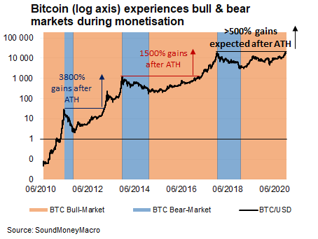 I expect that bitcoin will a new record high, surpassing the December 2017 high, before Q2 2021, perhaps sooner. All Time Highs (ATHs) optically appear expensive, but this event will merely confirm the next phase of the bull-market. I’m preparing for the bull-market to last another 3 quarters after the next ATH with potentially 500% gains.