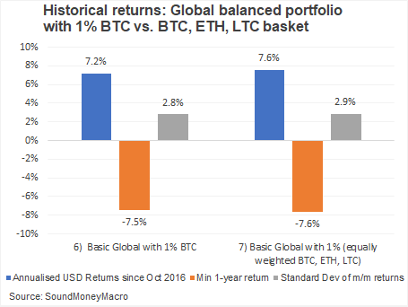 A global portfolio with 1% in a BTC, ETH, LTC basket improves returns relative to a global portfolio with just 1% in BTC but doesn’t improve the risk statistics. The annualised return from the portfolio increases from 7.2% to 7.5% but the drawdowns and standard deviation are pretty much unchanged. In other words, spreading one’s portfolio into alternative cryptocurrencies is a return enhancement not a risk mitigating measure.