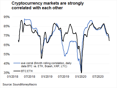 Backtesting data suggests that allocating to the broader crypto universe would have increased return potential over the past years. But there was no reduction in risk from making this decision. This outcome is virtue of the fact that most cryptos hold a strong correlation with bitcoin and thus they don’t offer much diversification. Ethereum presents a very different opportunity set to bitcoin, yet it still trades like a high beta bitcoin. Here is the 6-month rolling correlation between bitcoin and a few major crypto currencies, displaying a strong positive correlation (anything above 0.5 is a strong positive correlation). Its’ never gone negative.