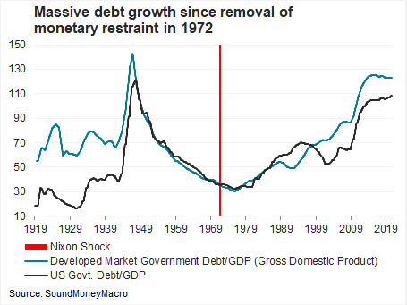 The global monetary system broke its linkage to gold in 1971 when US President Richard Nixon ended convertibility between the US dollar and gold. Ever since, the US budget deficit and government debt levels have become unhinged.