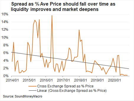 Cross-exchange spreads (price differentials between exchanges) are tight with efficient price activity across bitcoin markets. Once again, this data must be contextualised. Improving financial infrastructure, including arbitrage hedge funds, implies that the market is more efficient than 2017. I don’t expect cross-exchange spreads to blow-out like they did in 2017 again. Nevertheless, if the bitcoin market enters peak bull-market, I expect pricing efficiencies may emerge.