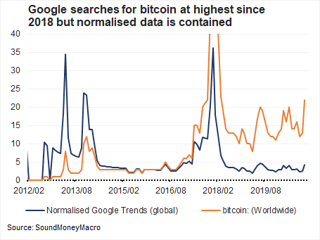 Google searches for bitcoin have started to rise in Nov, to the highest levels since 2018, so retail activity is coming back. But when we normalise the data to account for growing interest each cycle, the data remains contained. As adoption grows in each cycle I expect more google searches, which was the experience from 2013 to 2017. The normalised data suggests we’re a long way away from a speculative phase. Anecdotally, my experience confirms this. I’m speaking to numerous people about bitcoin, but very few of them have chosen to contact me. In Q4 2017 I received questions left right and centre from people I’d hardly ever met. All they wanted to do was “BUY BITCOIN” because their friends were making money. I shifted from bitcoin advocate to telling cautionary tales at that point. In hindsight this was a STRONG warning sign that the top was near, but I was too deep into the weeds to see the signs. Unfortunately, I think that another retail frenzy may characterise the last phase in this cycle. I expect the normalised index to rise above 10 at that stage, which will be a strong signal to take profits.