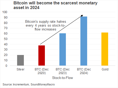 Bitcoin is the store of value for the digital age. Its supply is entirely pre-determined and supply growth halves every 4 years so the stock-to-flow ratio increases over time. In 2024 bitcoin will have a higher stock-to-flow ratio than gold. Bitcoin will become the scarcest monetary asset at this point.