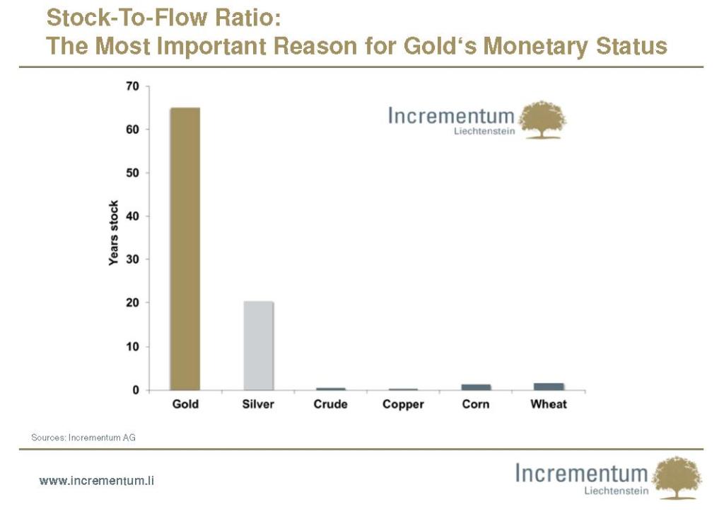 Gold is superior to other commodities as a store of value, which is displayed in its stock to flow ratio (thanks to Ronnie Stoeferle at Incrementum for the chart). We eat grain, we burn oil and we consume copper so the annual flow (or supply) is large relative to the amount of stock in the world. We can store these commodities but it’s expensive because they take up space and they may perish/corrode; hence they aren’t good stores of value. High stock-to-flow assets don’t corrode nor perish and their value cannot be inflated away by a large increase in new supply (flow). Gold miners cannot produce trillions of tones of gold in the next year, just because the price hit an all-time high in 2020. They have to find new deposits, build the mines, develop the infrastructure and will only start pulling new gold out of the ground in years to come. So, the influence of supply on the value of gold is low, which is a desirable characteristic for a store of value.