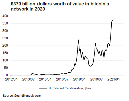 As of mid-Dec 2020, bitcoin has >$370bn worth of capital allocated onto the network. This is small relative to gold at $10tn but it’s fast growing into a deep and liquid financial market. Exchanges are active 24/7 in most countries around the world so you can buy or sell bitcoin at the click of a button in reasonably large quantities, which is a pretty powerful network effect.