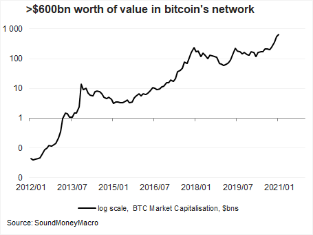 And while I caution against watching the price alone, bitcoin’s price is a confirmation of the growing global community. Bitcoin’s network has grown above $0.6tn this year. That’s a large amount of capital allocated to a decentralised digital network that isn’t controlled by any individual or organisation.