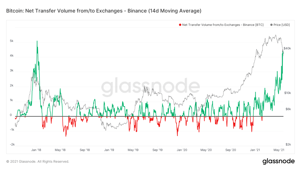 While institutions may have started this month’s sell-off, evidence suggests that retail investors are the major driver of the price capitulation. There has been a shift of coins onto Binance, which is the world’s biggest exchange and tends to be dominated by retail. I.E. retail traders have moved coins onto exchange to take profits. By contrast, Coinbase, dominated by US corporate flows, has continued to experience outflows.