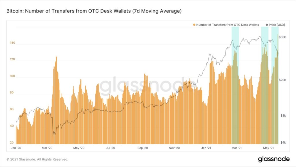 These contrasting flows between Coinbase and Binance suggests that capital could be shifting from retail investors to institutional. The thesis is supported by the sharp reduction in transfers out of OTC Desks during each BTC price decline over the past few months.