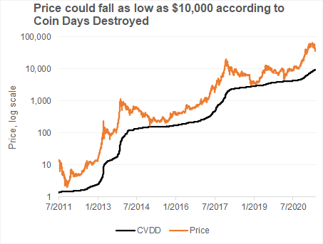 Cumulative Value-Days Destroyed (CVDD) is the ratio of the cumulative USD value of Coin Days Destroyed and the market age (in days). It generally provides the absolute market floor on the price. You can see that in the past the price barely touched this indicator. If you waited for the price to fall below CVDD you may never have bought at the previous market bottoms. I.E. There is almost zero chance that we reach $10K. $10K is an almighty decline from $30K so I am not taking this lightly, but it is good to know where the absolute price floor sits.