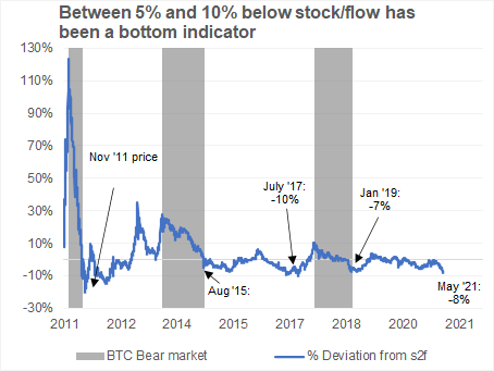 Historically, bear markets saw price deviate sharply away from the stock to flow (S2F) model. I.E. Bitcoin’s market capitalization fell notably below that which was predicted by the scarcity of the asset. During the 2011 bear-market the price fell 20% below the S2F prediction and during the 2015 and 2019 bear markets price fell 7% below the S2F predication. We have also experienced one large downside deviation, which was outside of a bear-market – during July 2017 (the previous bitcoin bull-market) price fell 10% the S2F prediction.