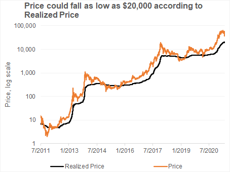 Realized price is based on the realized capitalization, which measures the price at which coins were last moved. It suggests that price could fall as low as $20K.